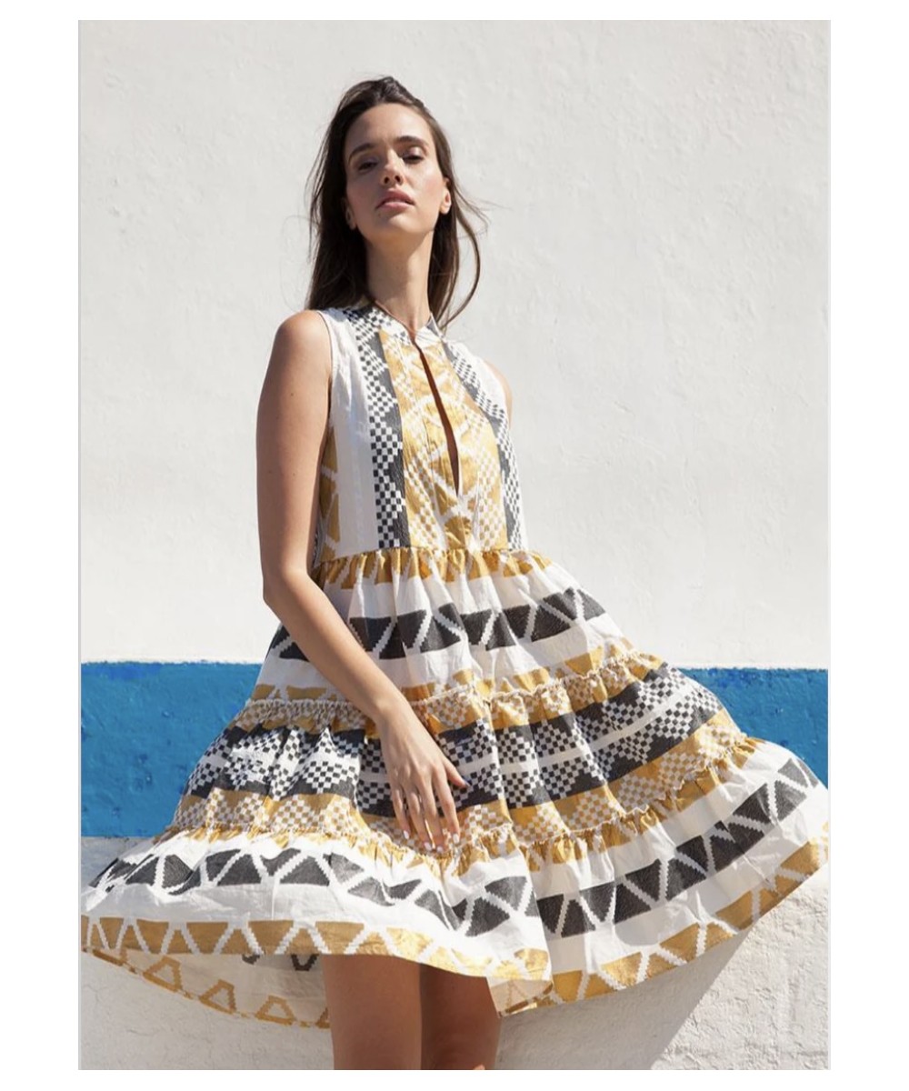 The Santorini Dress, by Aphaia Resort, features exquisite embroidery in a stunning gold/black color combination. Elevate your style with this luxurious and sophisticated piece.